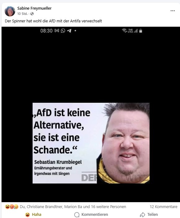 Zitat er Quel­le: „Der Spin­ner hat wohl die AfD mit der Anti­fa ver­wech­selt.„